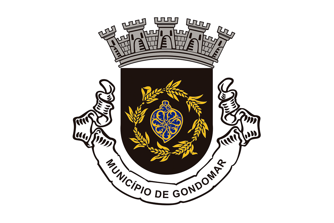 De negro, com o coração de filigrana de ouro esmaltado de azul, acompanhado por uma grinalda de oito espigas de trigo de ouro, sustidas e folhadas do mesmo. Coroa mural de prata de cinco torres, Lintel branco com os dizeres “Município de Gondomar” em negro.