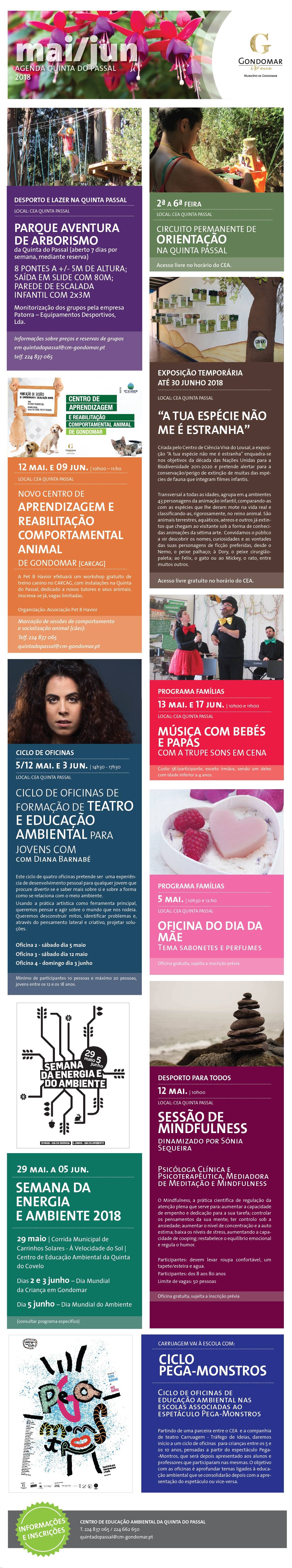 A atividade do Centro de Educação Ambiental Quinta do Passal em resumo. Iniciativas, abertas aos gondomarenses, da responsabilidade da Câmara Municipal, das Juntas de Freguesia, do Movimento Associativo, das Escolas e também de entidades privadas, são aqui divulgadas.
