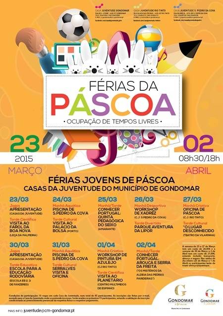 Entre 23 de março e 2 de abril, a Câmara Municipal de Gondomar dinamiza as Férias Jovens Páscoa 2015, um programa de ocupação de tempos livres na pausa escolar, dirigido a crianças e jovens dos 6 aos 15 anos, com diversas atividades que poderão ser consultadas no programa anexo.