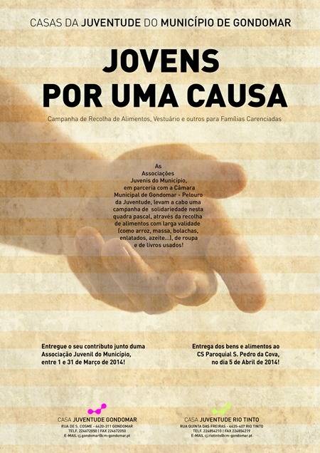 Foi com esta preocupação que, no ano passado, a Câmara Municipal de Gondomar em parceria com as associações juvenis do Município levaram a cabo a campanha “Jovens Por uma Causa”, que visa a recolha de alimentos, vestuário, livros usados e outros, durante a quadra pascal, e que, posteriormente, são entregues a uma instituição de solidariedade social do Município.