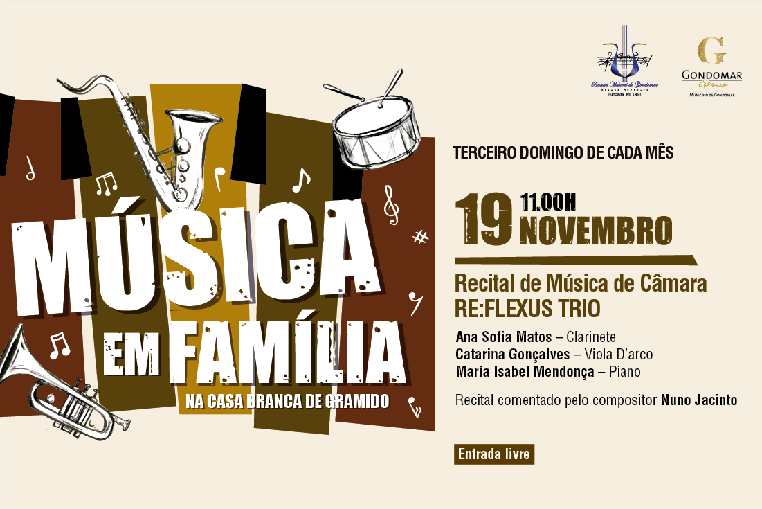 A Casa Branca de Gramido acolhe, no dia 19 de novembro, o recital de música de câmara pelo Re:Flexus Trio, integrado no ciclo de concertos “MÚSICA EM FAMÍLIA”, promovido pelo Município de Gondomar em parceria com a Banda Musical de Gondomar.
