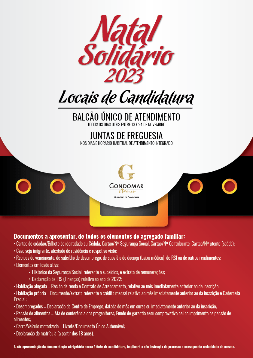 O período de candidaturas decorre de 13 a 24 de novembro de 2023, no Balcão Único de Atendimento Municipal e nas Juntas e Uniões de Freguesia do concelho de Gondomar, nos dias e horários do Serviço de Atendimento Integrado.